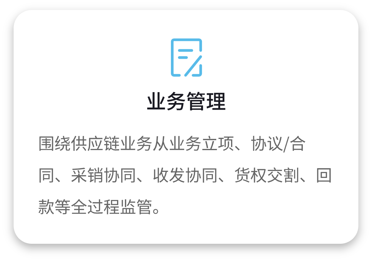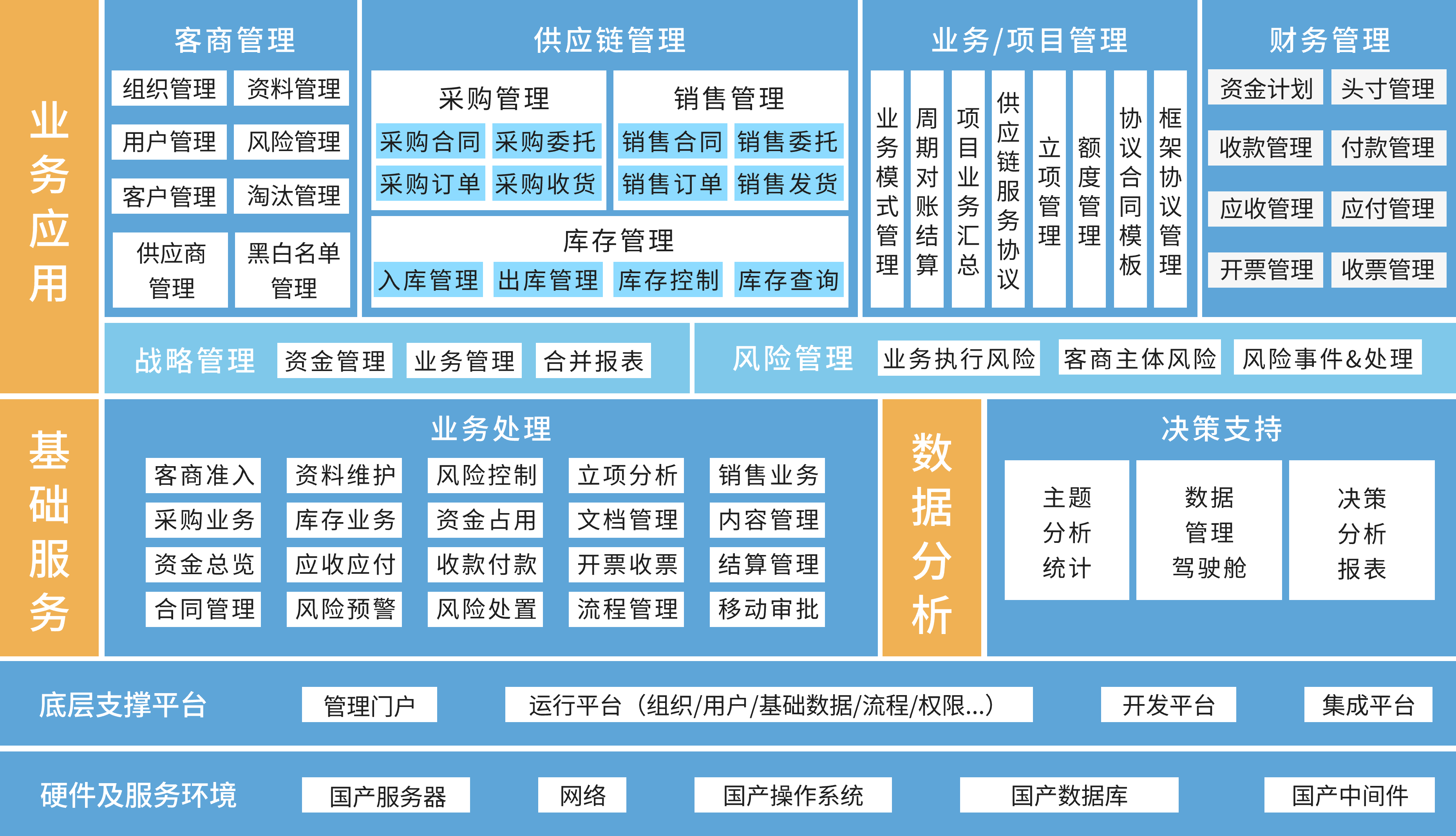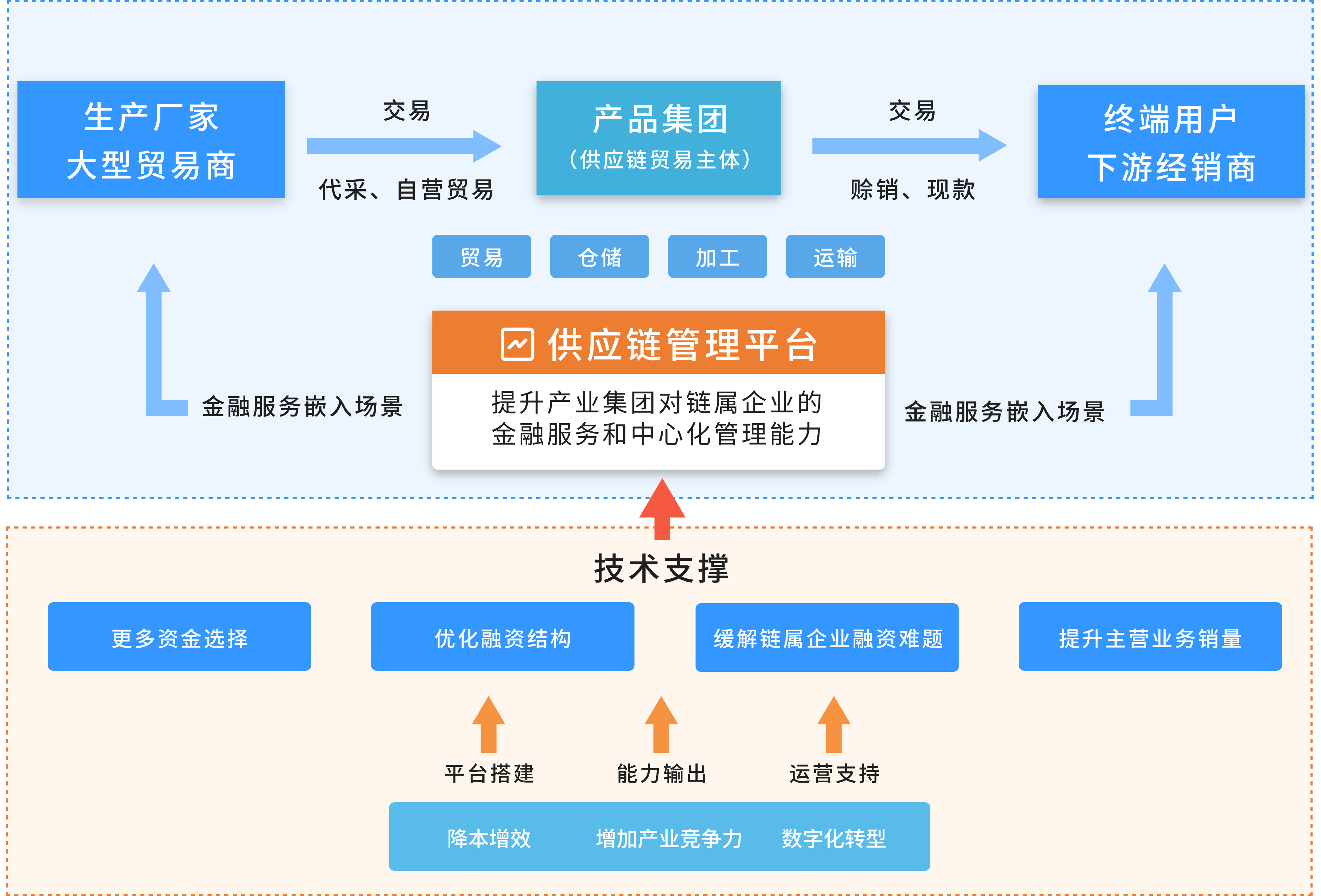 帝隆供应链管理(SCM)系统,围绕产业链上采购、交易、销售、支付、仓储等诸多贸易背景,借鉴帝隆科技多年的业务沉淀与积累,运用区块链、大数据、云计算、人工智能等金融科技能力,从供应链产业链整体出发,通过“金融科技+供应链场景”方式及全线上化的业务流程,整合信息流、物流、资金流等信息,构建供应链核心企业、上下游企业、金融机构、第三方机构一体化的金融供给和风险防控体系,提供一站式智慧供应链协同平台。