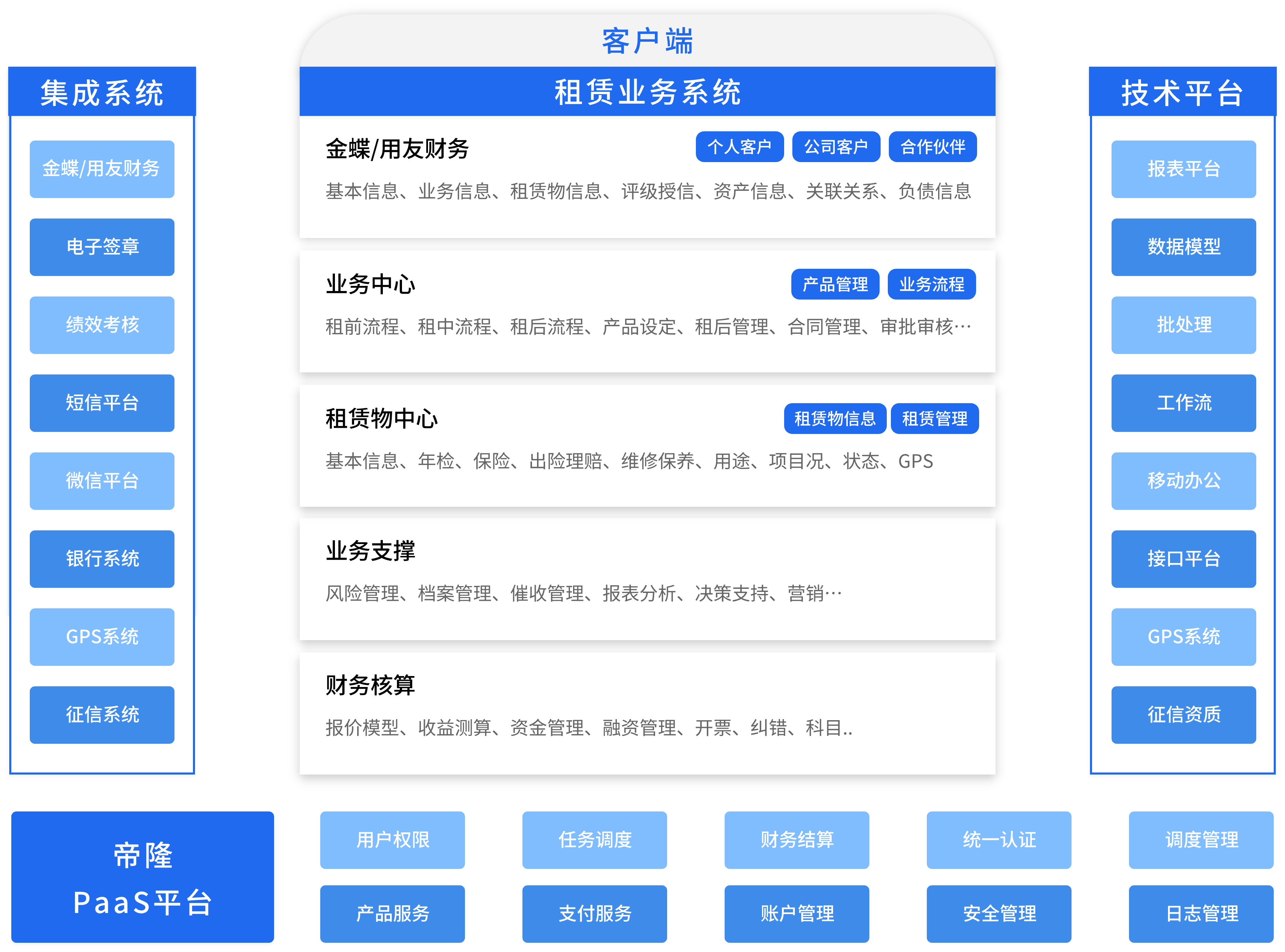 针对融资租赁公司面临的挑战及业务模式,满足多种融资租赁业务管理需求,结合融资租赁的监管要求及行业特点,帝隆科技为融资租赁公司量身锻造了一套全终端的融资租赁业务管理系统,有效地解决了融资租贯公司业务运营过程中面临的诸多挑战。通过数字营销、租赁业务管理、可视化流程管理,智能数据决策分析、强大的风控体系让您的业务更智慧更高效,支持直租、回租、经营性租赁等业务模式的融租业务信息化管理平台。基于银行系统架构设计,功能全面,多终端覆盖,提供PC+移动端(Android\iOS)+微信公众号+小程序全终端产品系统,快速交付,节约成本。