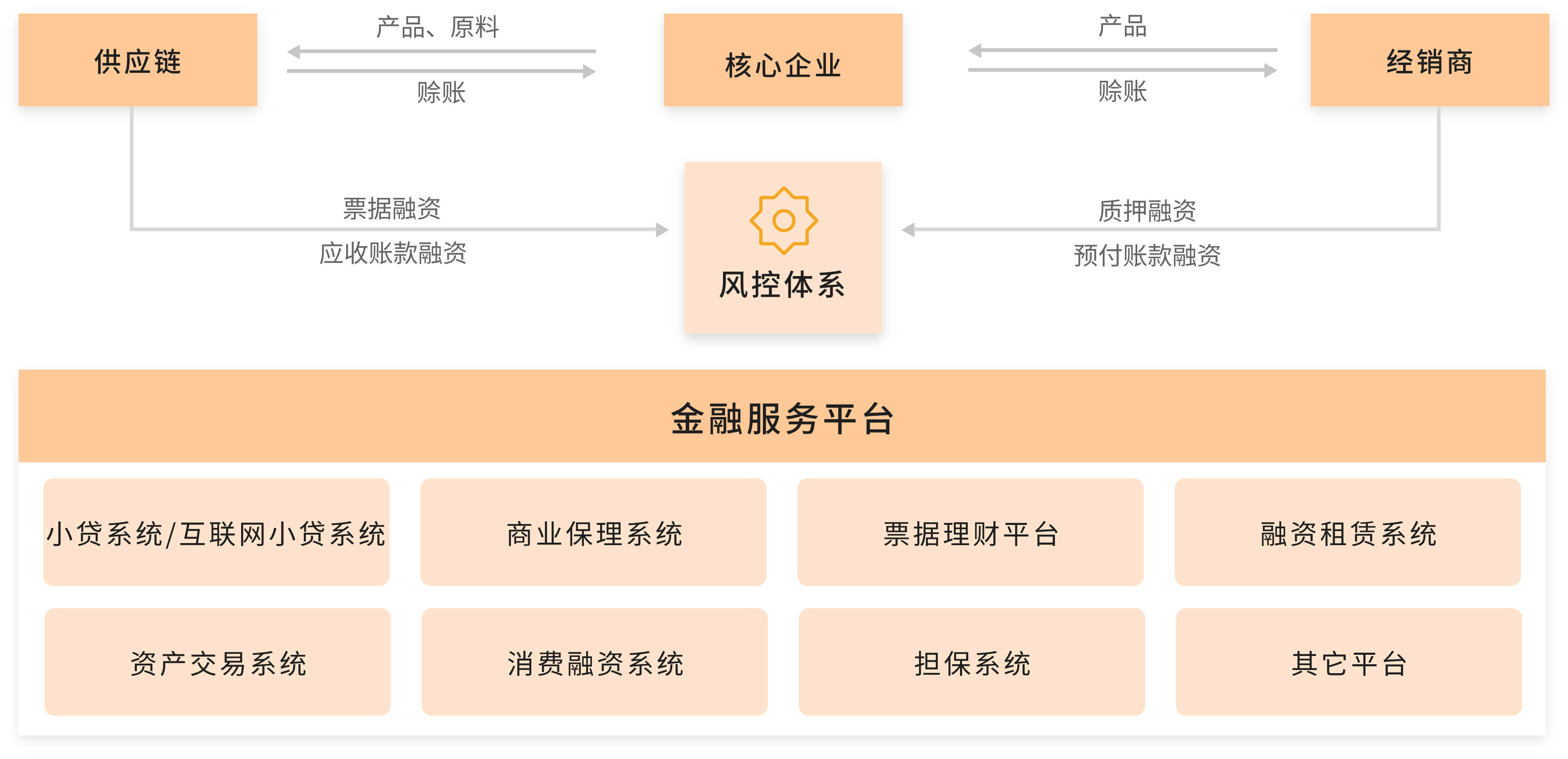 灵活组合供应链环节应收类(应收账款融资、保理融资)、存货类 (订单融资、库存融资)、预付类融资(保兑仓、先款后货)、电票融资、信贷融资等各类型金融产品。线上一体高效运作