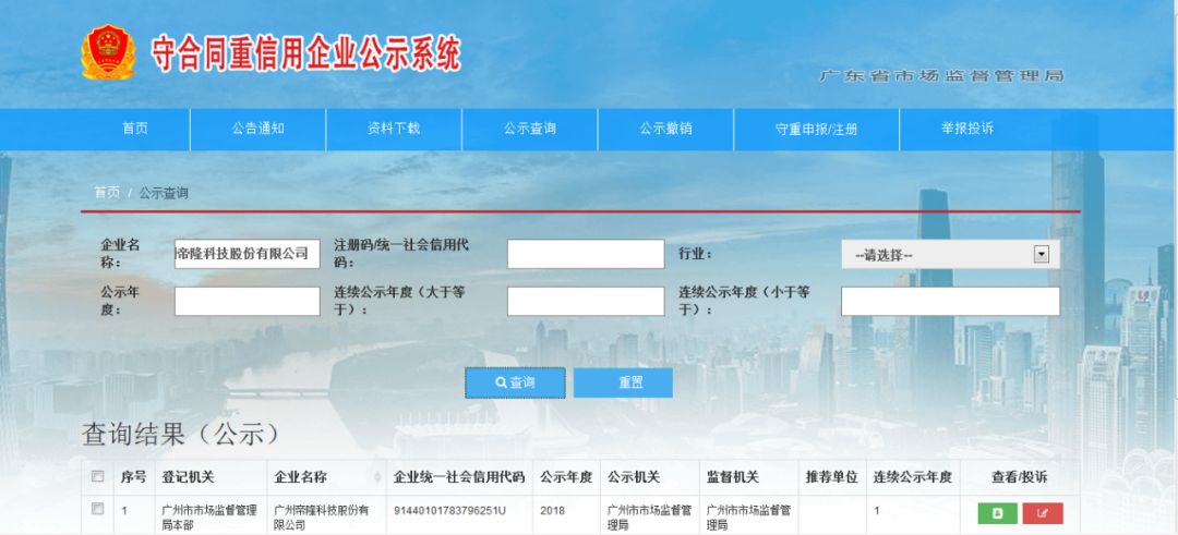 查询方式二:输入网址:http://sz.gdgs.gov.cn/search,然后输入“广州帝隆科技股份有限公司”查询,即可查看企业公示情况。